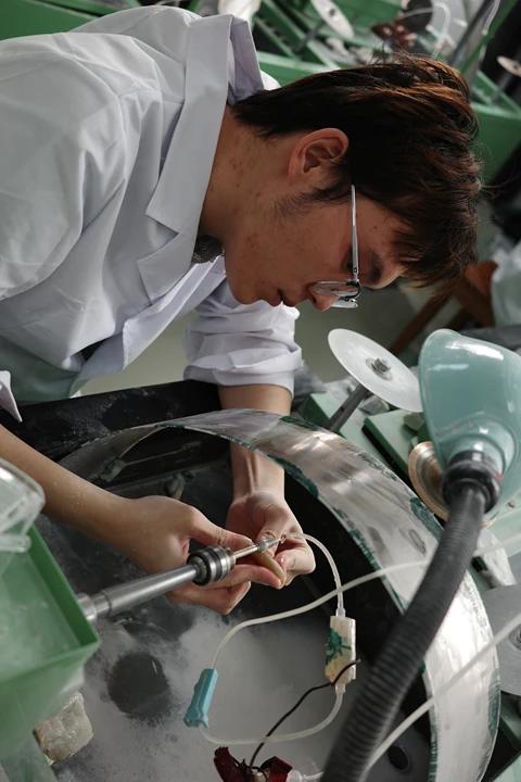 王明哲正在上的玉雕课,本学期要提交4件作品。首先由老师在课堂上给出主题,然后由学生结合玉石原料的结构、材质特点进行自主设计,并着手分解、雕琢。王明哲拿到的青花料,内部是蜘蛛网一般密密麻麻的裂痕,即便如此也不能轻易丢弃,如何将玉石内部存在的绵、裂做成特色,是对玉雕师水平的考验,也是课程中沈罕要传授给学生的技巧。