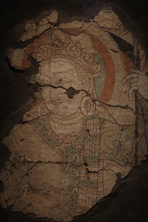 和田地区博物馆展示的唐代毗沙门天像壁画,出土自当地策勒县佛寺遗址。古代和田曾是一个知名的佛教国家。新京报记者 戴轩 摄