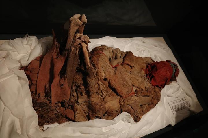 和田地区博物馆展示的一具新疆干尸文物,其被摆放的特殊腿部姿势,被认为与性别有关。新京报记者 戴轩 摄